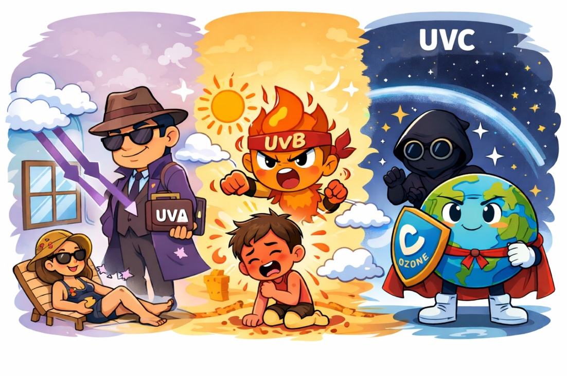 The “big brother,” UVA (315-400 nm), makes up about 95% of the UV rays that reach us. He may seem gentle, but he has a powerful ability to penetrate, passing easily through glass and clouds to reach the deeper layers of the skin. UVA is the slow but steady culprit behind tanning, premature aging, and wrinkles, working quietly yet persistently.