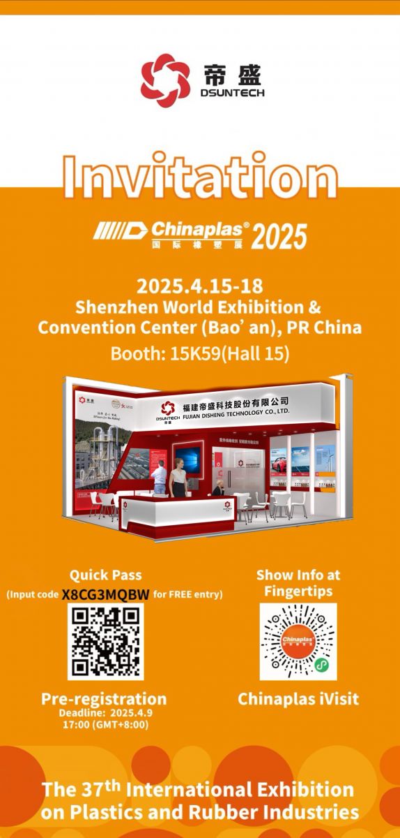 The 37th China International Plastics and Rubber Fair (CHINAPLAS 2025) will be held from April 15th to 18th at the Shenzhen International Convention and Exhibition Center (Baoan Pavilion). Disheng Technology will bring new products and innovative solutions for plastics and rubber to the exhibition, focusing on the themes of circular economy, innovative materials, digital manufacturing, etc. We sincerely invite new and old customers to visit us at booth 15K59 for exchange and cooperation!