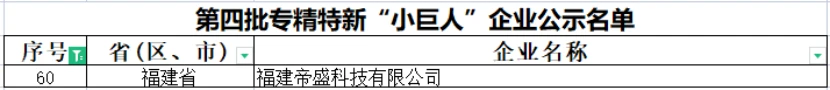 福建帝盛科技有限公司荣获国家级专精特新“小巨人”企业称号